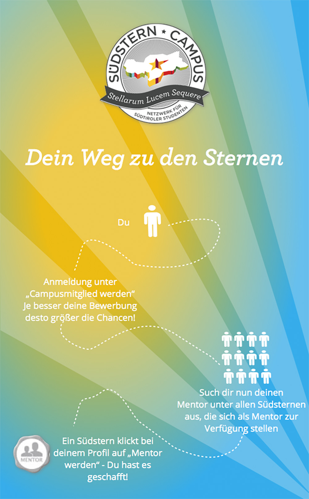 "Stellarum Lucem Sequere" - Folge dem Licht der Sterne: so lautet das Motto der Südstern-Initiative für Südtiroler Studenten. Der Südstern Campus bietet Studenten die Möglichkeit, sich bei Südtirolern im Ausland vorzustellen und einen dieser Südsterne als Mentor zu gewinnen. Nach der erfolgreichen Anmeldung bei Campus scheint den Campus-Mitgliedern eine Liste von Südsternen auf, die sich als Mentor zur Verfügung gestellt haben. Campus-Mitglieder können sich einen Mentor aussuchen und mit diesem in Kontakt treten. Umgekehrt können sich auch Südsterne unter den Campus-Mitgliedern jemanden aussuchen und sich als Mentor bei diesen melden.